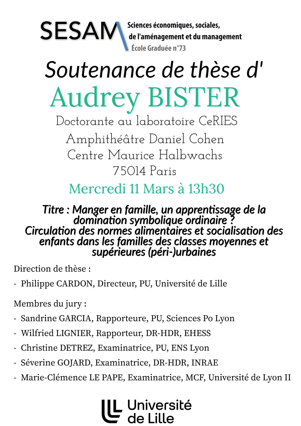 Soutenance de thèse de Madame A.BISTER 11mars 13h30 Partager sur X Partager sur Facebook Amphi D.Cohen Centre Maurice Halbwachs Paris 14