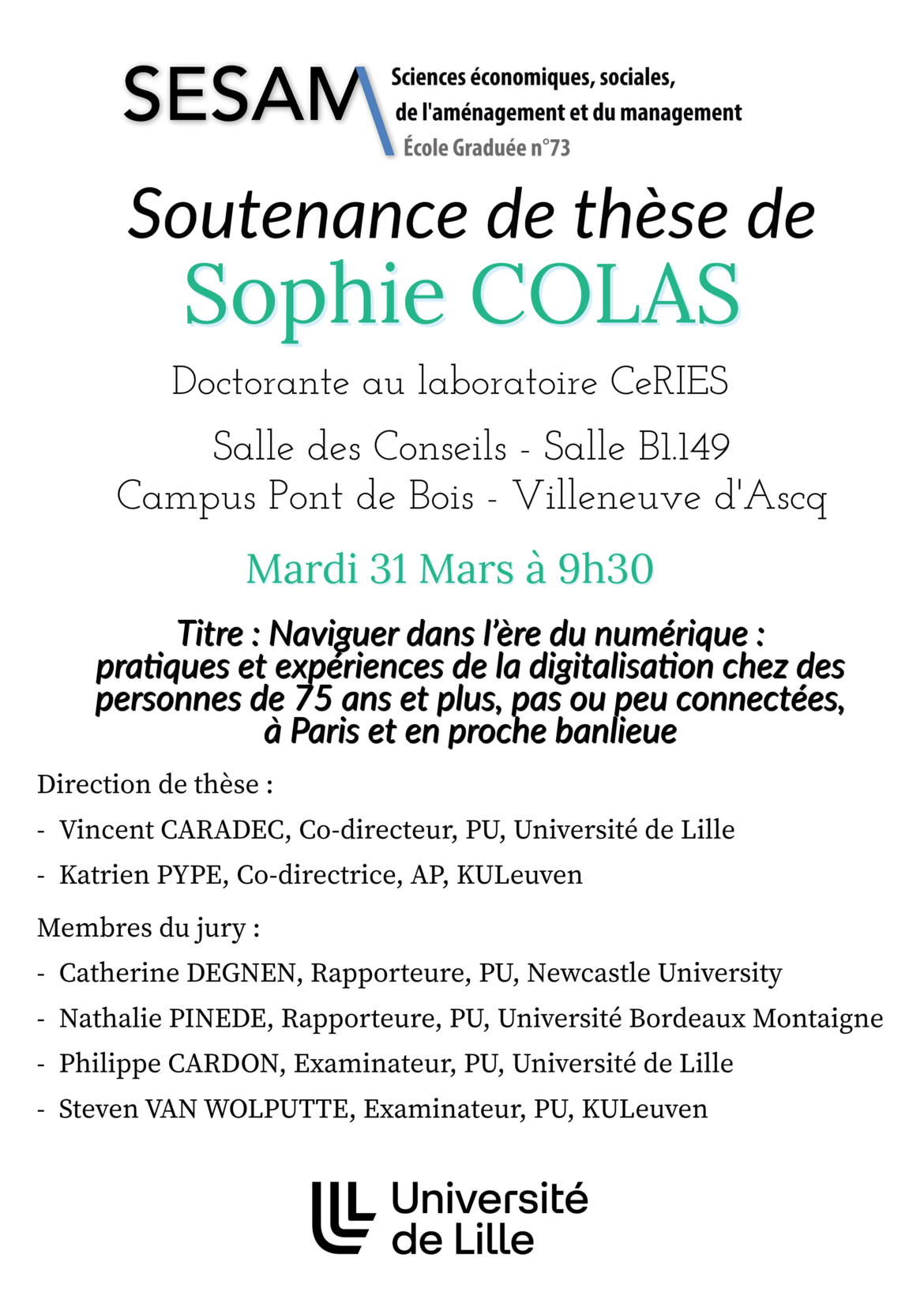 Soutenance de thèse de Madame S.COLAS 31mars 09h30 Partager sur X Partager sur Facebook Salle des Conseils Salle B1.149 Campus Pont de Bois